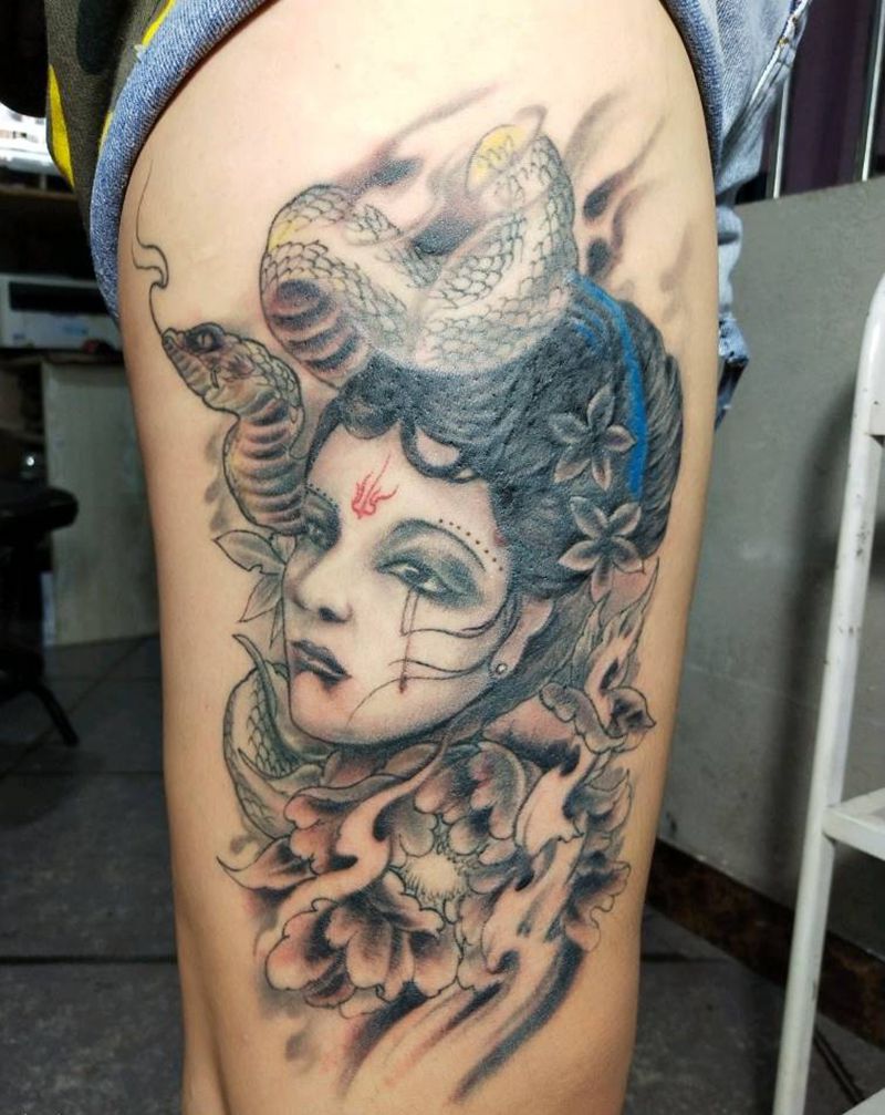 • T网红王老大花腿龙纹身图片_腿部新传统纹身图案