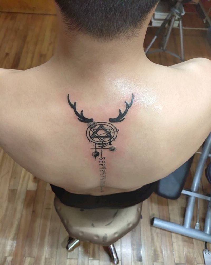 鹿角 数字 英文纹身图片_背部几何水墨纹身图案
