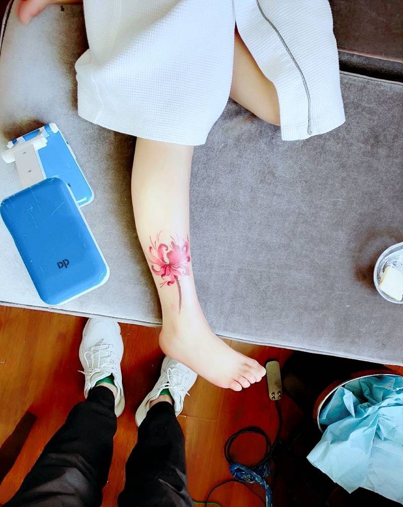 彼岸花纹身图片_腿部脚部新传统水彩纹身图案