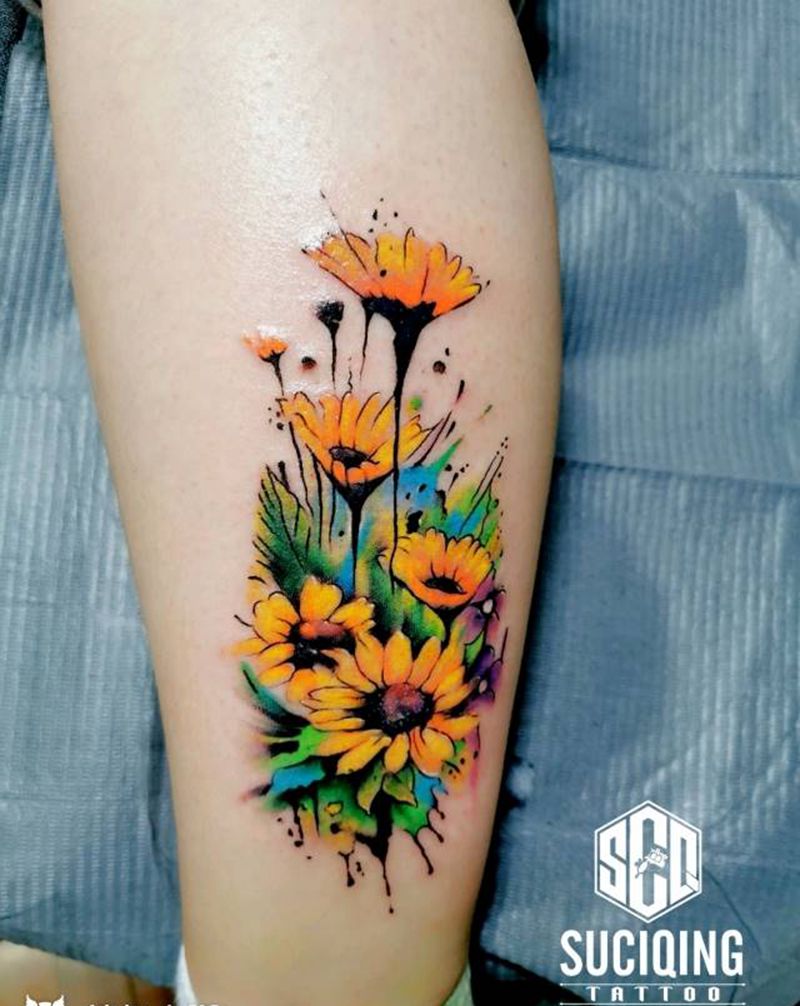 向日葵纹身图片_腿部脚部新传统水墨纹身图案