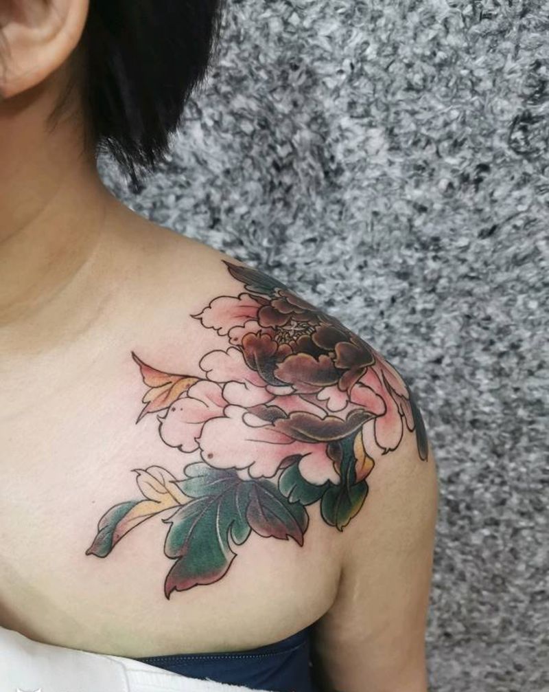 牡丹纹身图片_胸部肩部新传统Old School纹身图案