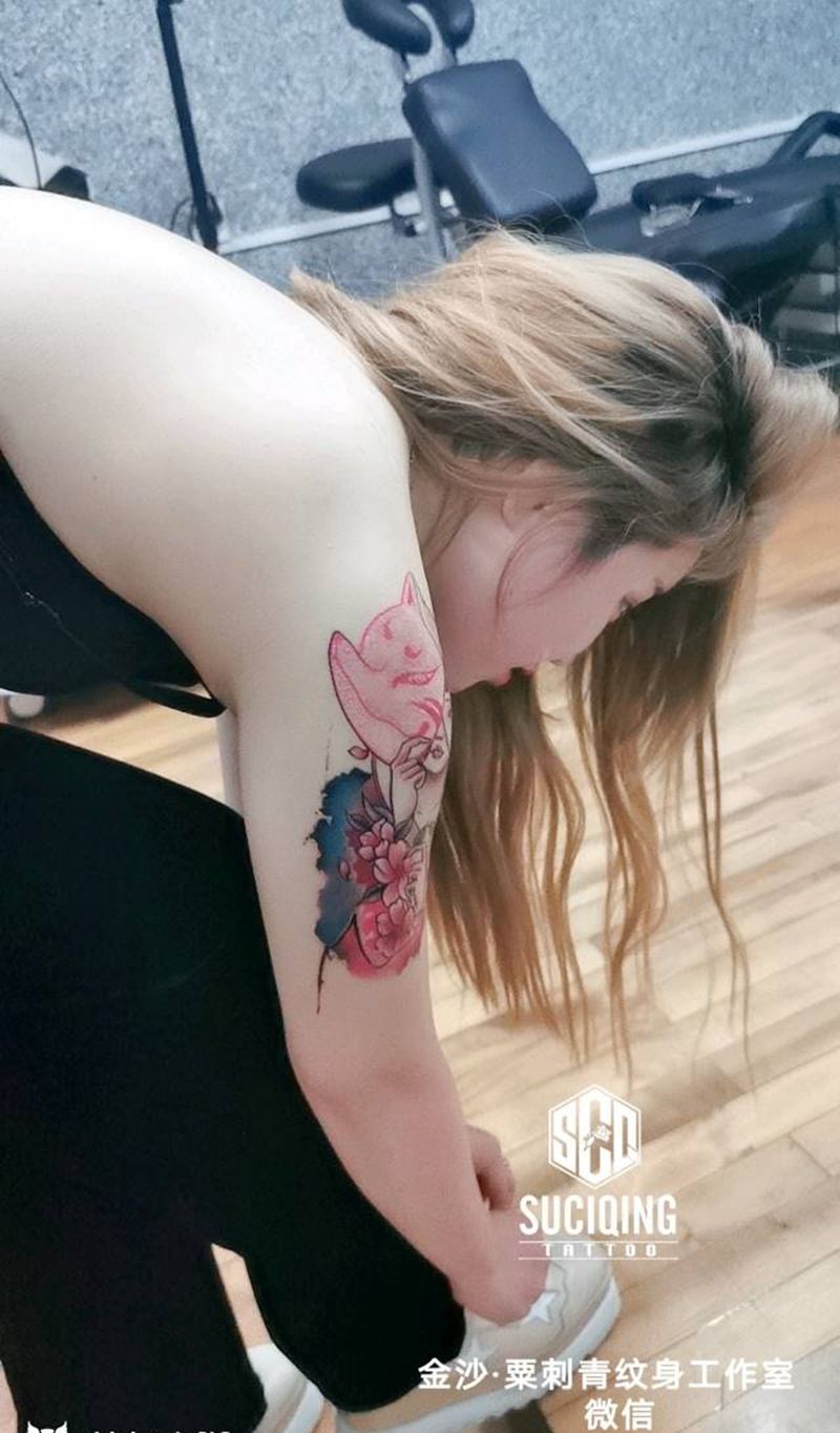 当前位置: 首页 >贵州省遵义市纹身店-粟刺青纹身图案>面具美女纹身图片_手臂手部新传统水墨原创纹身图案