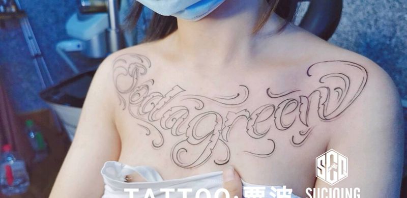 V胸英文纹身图片_胸部花体字克隆版纹身图案
