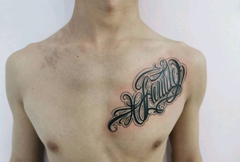 英文《家庭》纹身图片_胸部欧美写实花体字英文纹身图案
