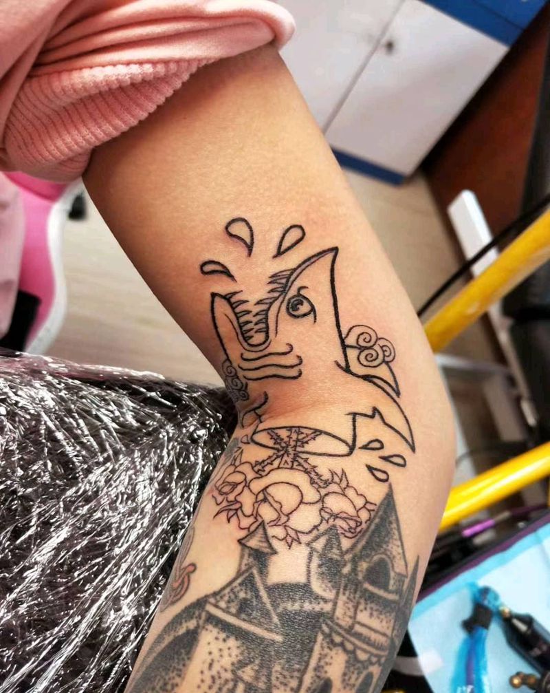 受伤的鲨鱼纹身图片_手部手臂New School点刺纹身图案