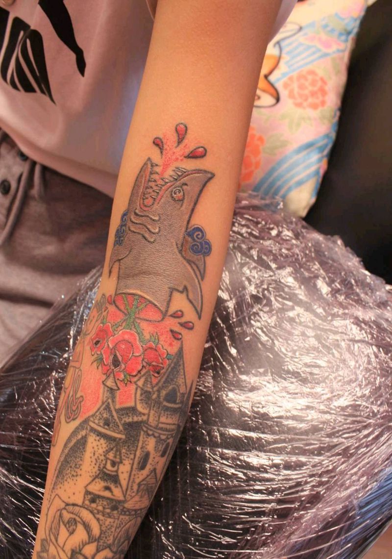 受伤的鲨鱼纹身图片_手部手臂New School点刺纹身图案