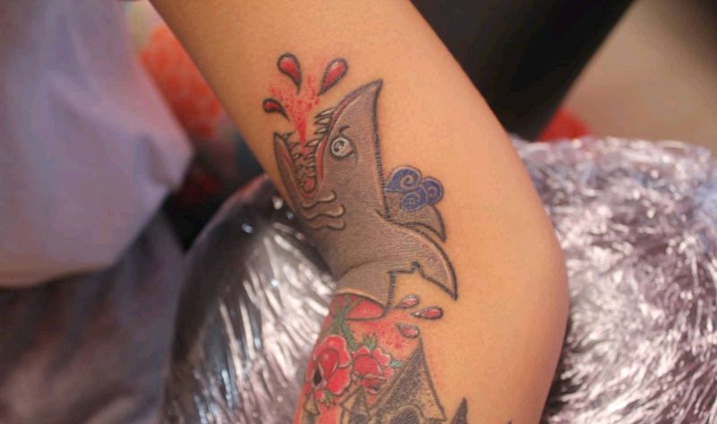 当前位置: 首页 >贵州省黔西南布依族苗族自治州纹身店-嘉木刺青纹身图案>受伤的鲨鱼纹身图片_手部手臂New School点刺纹身图案