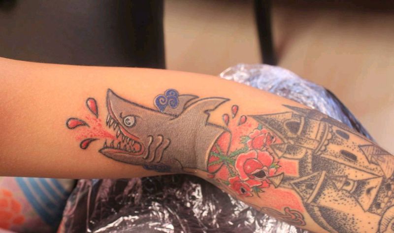 受伤的鲨鱼纹身图片_手部手臂New School点刺纹身图案