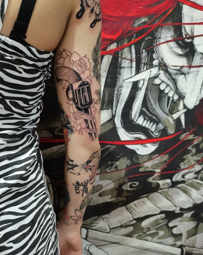 当前位置: 首页 >贵州省毕节市纹身店-毕节纹名堂方石刺青纹身图案>拼接纹身图片_手臂Old School纹身图案