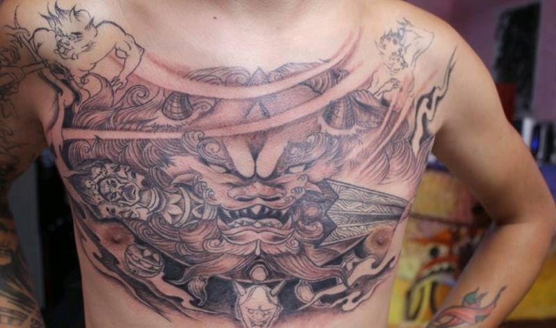 当前位置: 首页 >贵州省黔西南布依族苗族自治州纹身店-嘉木刺青纹身图案>唐狮纹身图片_胸部新传统纹身图案