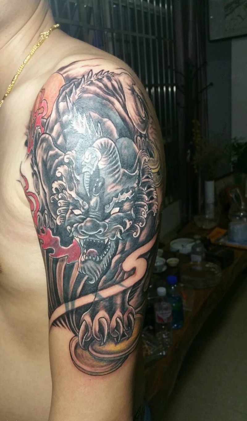 • T网红王老大花腿龙纹身图片_腿部新传统纹身图案