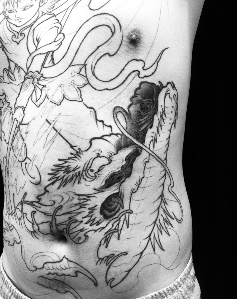 哪吒 社会 图纹身图片_腹部新传统人物 龙纹身图案