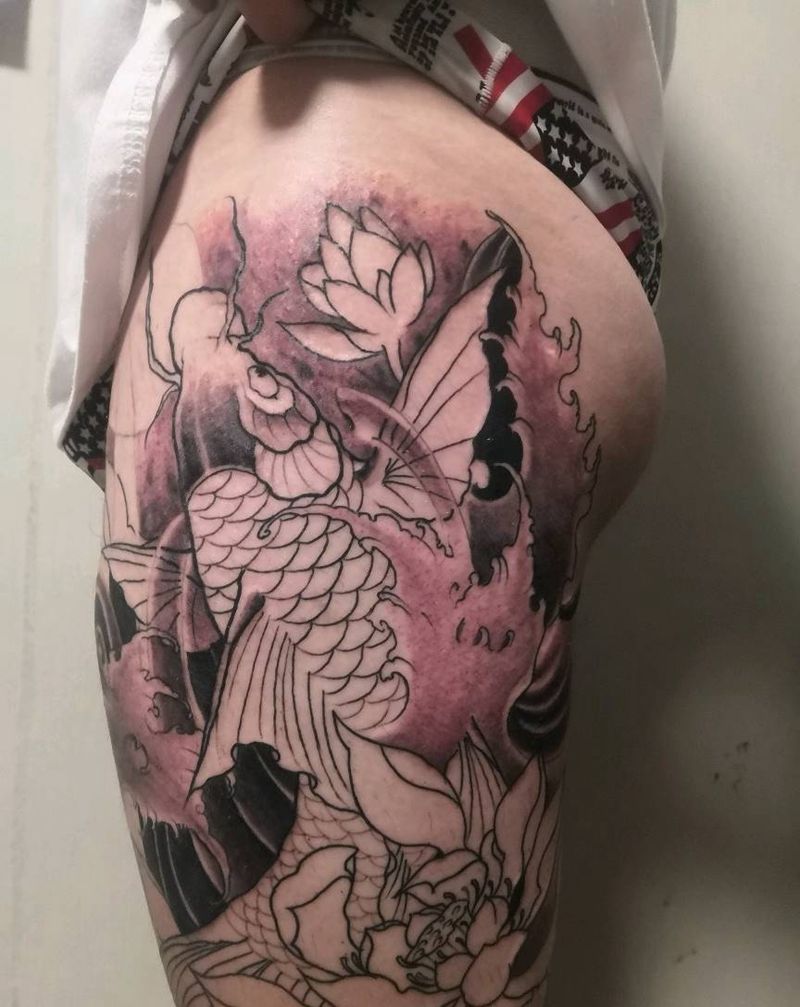 新传统锦鲤荷花 黑灰快完了 下纹身图片_腿部新传统鲤鱼荷花纹身图案
