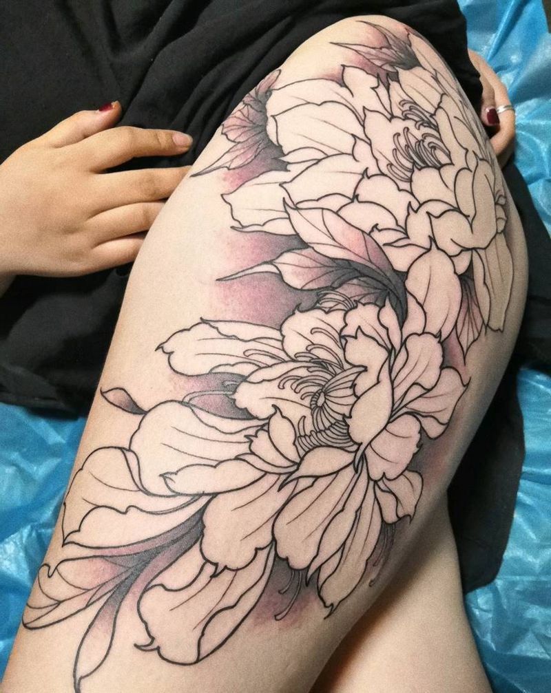 牡丹纹身图片_腿部臀部新传统New School牡丹纹身图案