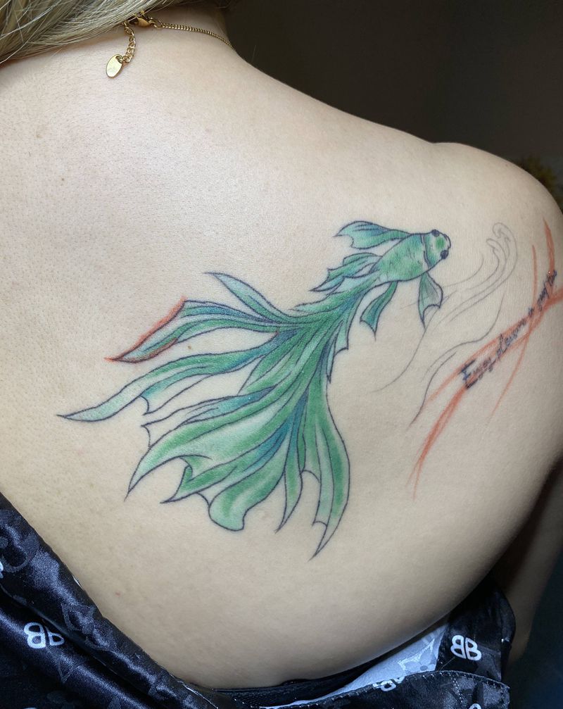 毁皮修改纹身图片_背部水彩金鱼纹身图案