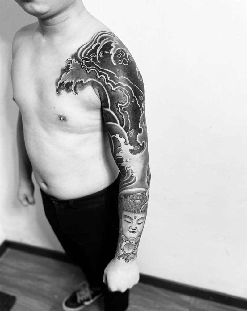 当前位置: 首页 >贵州省安顺市纹身店-后街刺青纹身图案>佛柔似水纹身图片_手臂新传统纹身图案