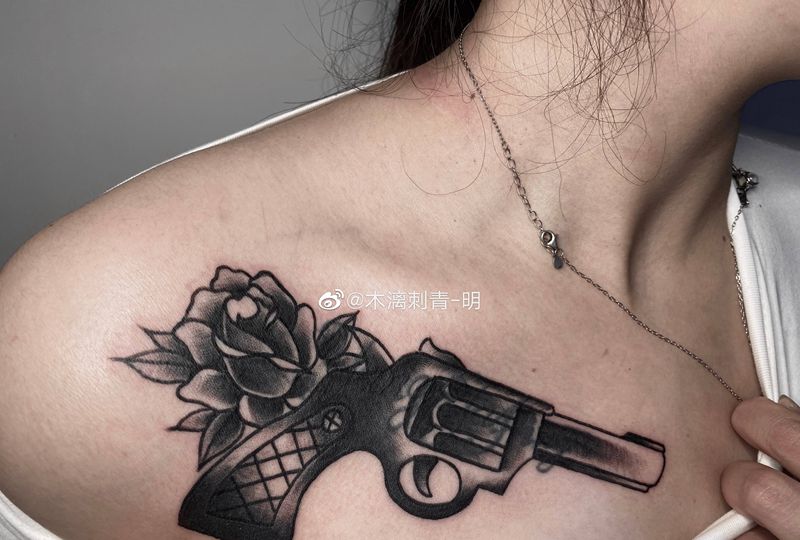 手枪遮盖纹身图片_胸部Old School玫瑰左轮纹身图案