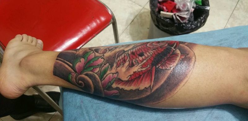 • T网红王老大花腿龙纹身图片_腿部新传统纹身图案