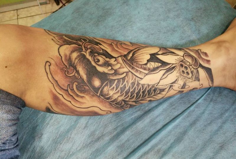• T网红王老大花腿龙纹身图片_腿部新传统纹身图案