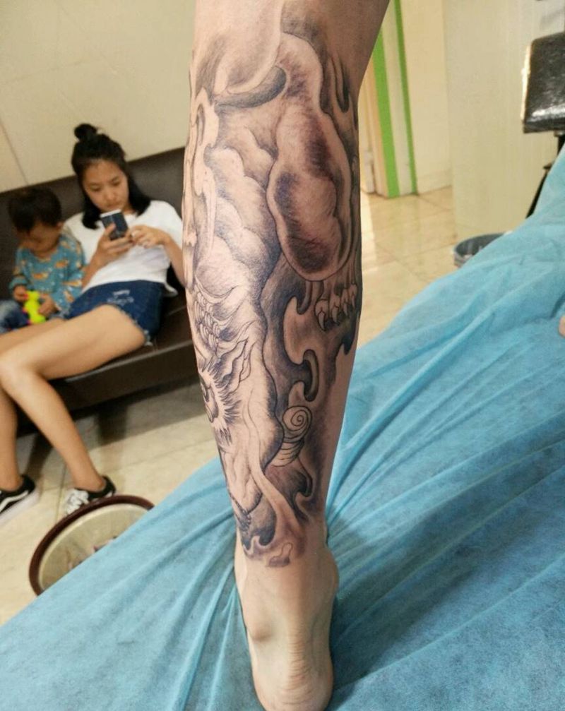 • T网红王老大花腿龙纹身图片_腿部新传统纹身图案
