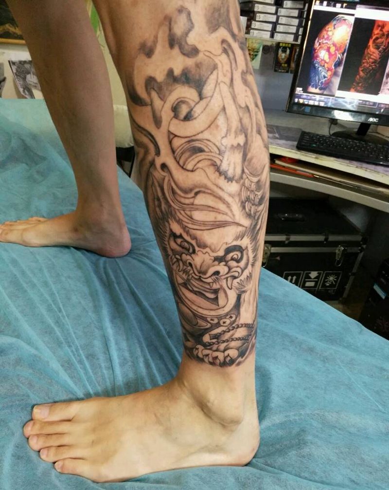 • T网红王老大花腿龙纹身图片_腿部新传统纹身图案