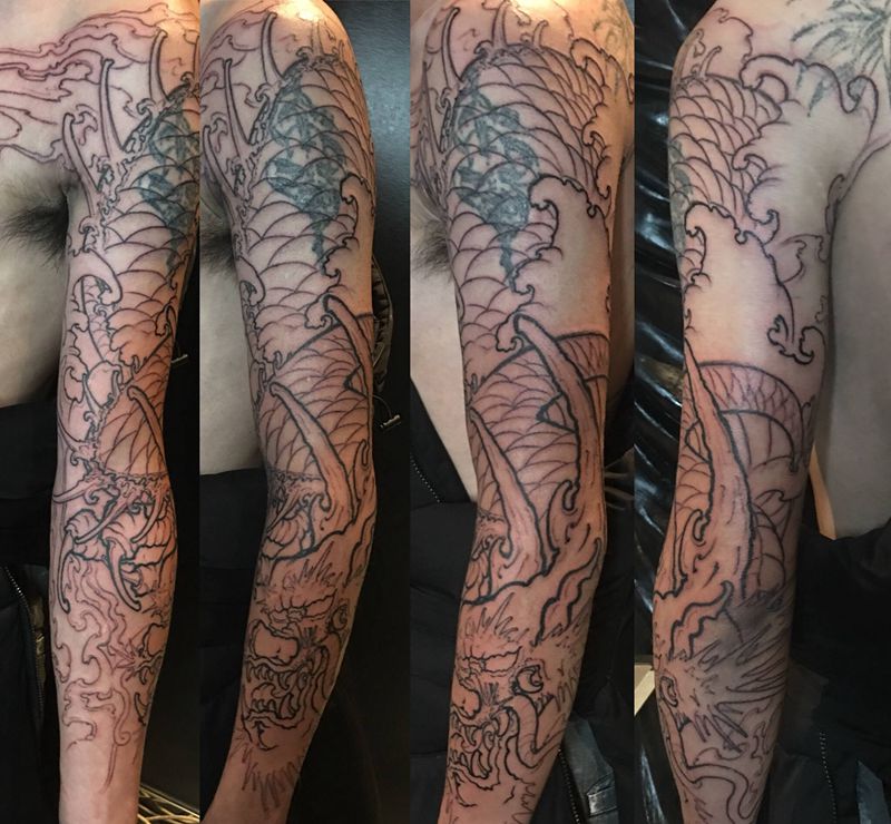 当前位置: 首页 >云南省昆明市纹身店-异士刺青纹身图案>原创传统花臂龙遮盖纹身图片_手臂手部新传统New School龙花臂传统纹身图案