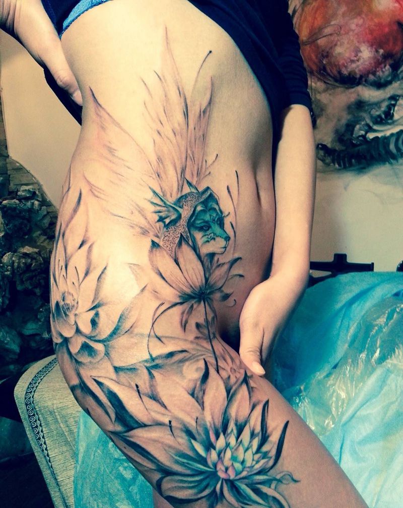 荷纹身图片_原创清新植物臀部腰部成品飘逸纹身图案