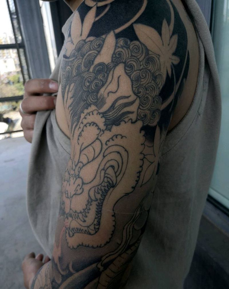 • T网红王老大花腿龙纹身图片_腿部新传统纹身图案