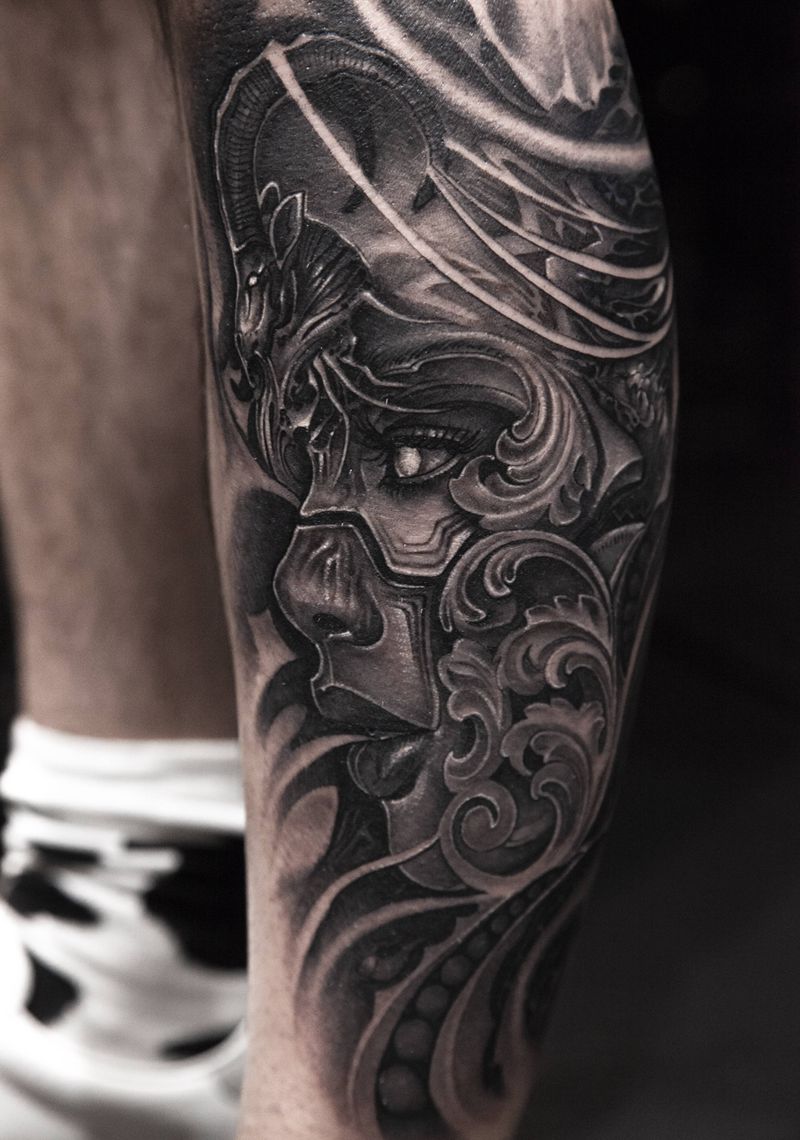 暗黑/女头纹身图片_腿部欧美写实暗黑写实纹身图案