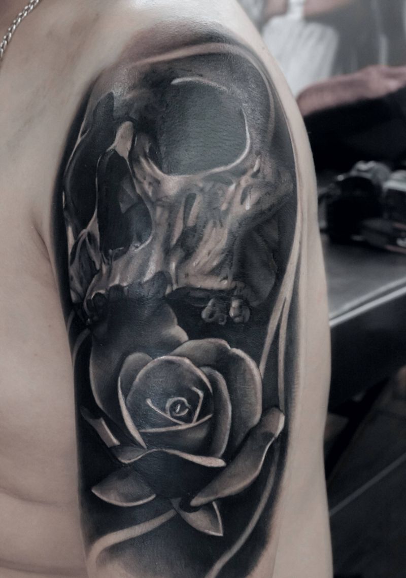 当前位置: 首页 >云南省昆明市纹身店-昆明鬼手纹身小鬼店纹身图案>骷髅花纹身图片_欧美写实纹身图案