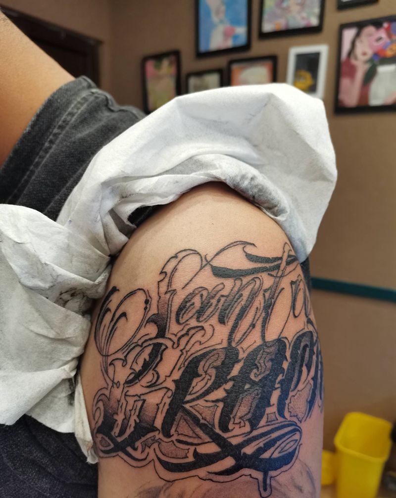 当前位置: 首页 >云南省昆明市纹身店-W刺青工作室纹身图案>拼接的奇卡诺花体字纹身图片_手臂纹身图案