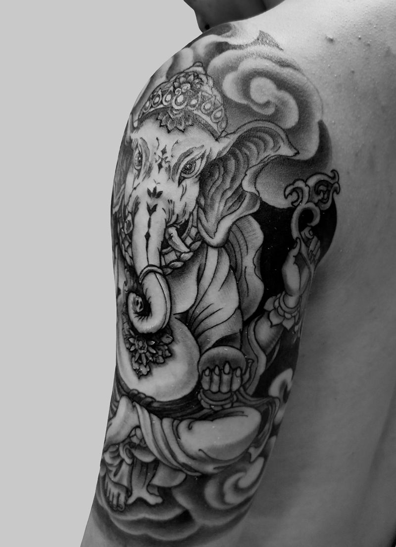 当前位置: 首页 >云南省昆明市纹身店-南無文畫刺青工作室纹身图案>半胛象神纹身图片_胸部手臂新传统象神纹身图案