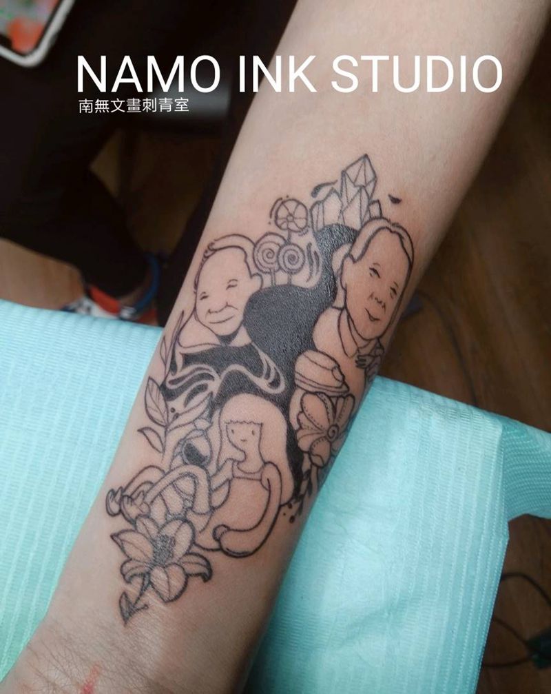 当前位置: 首页 >云南省昆明市纹身店-南無文畫刺青工作室纹身图案>外公外婆纹身图片_手臂纹身图案