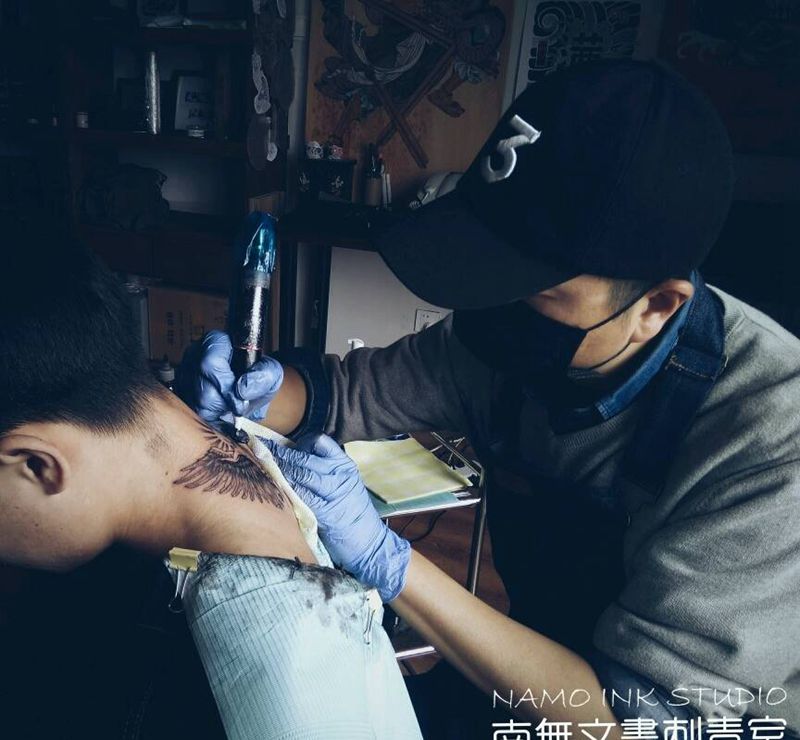 当前位置: 首页 >云南省昆明市纹身店-南無文畫刺青工作室纹身图案>堕落天使纹身图片_颈部欧美人物成品手稿纹身图案