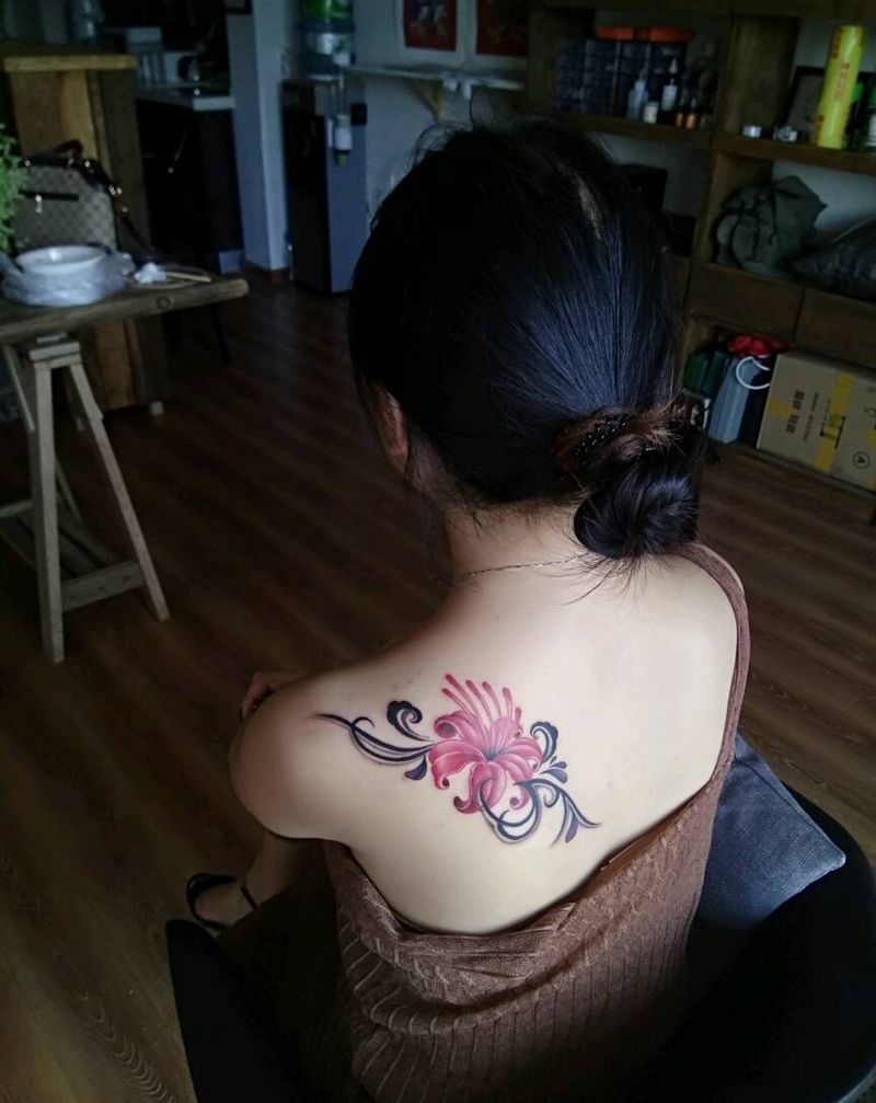 彼岸花纹身图片_背部清新植物成品纹身图案