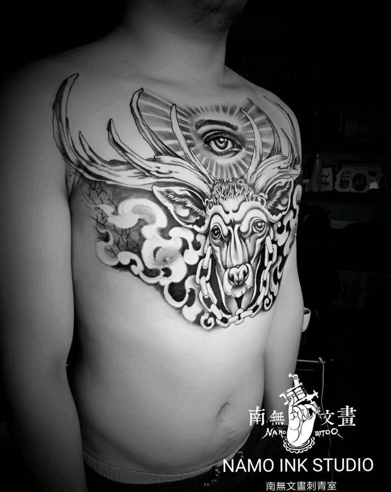 当前位置: 首页 >云南省昆明市纹身店-南無文畫刺青工作室纹身图案>麋鹿花胸纹身图片
