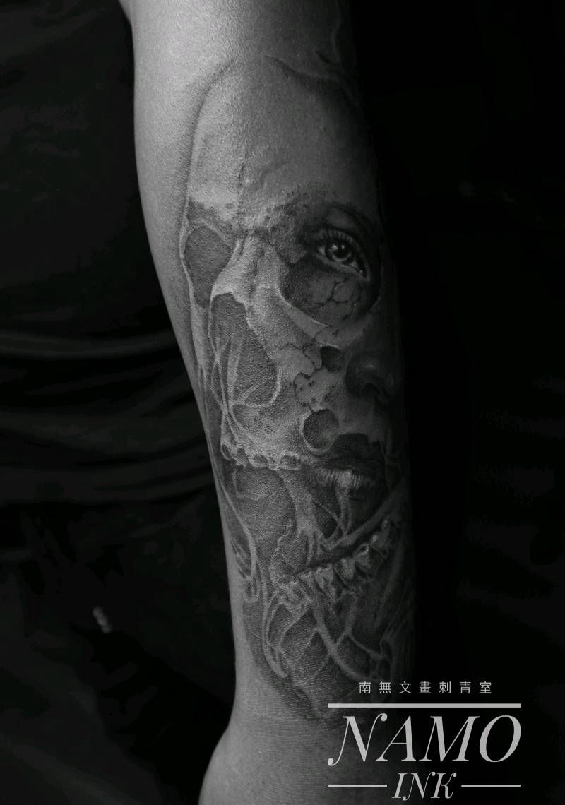 当前位置: 首页 >云南省昆明市纹身店-南無文畫刺青工作室纹身图案>小臂骷髅脸纹身图片_手臂纹身图案