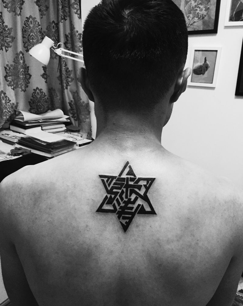 当前位置: 首页 >云南省昆明市纹身店-Yeci。Tattoo纹身图案>六芒星纹身图片_成品背部字符几何原创纹身图案