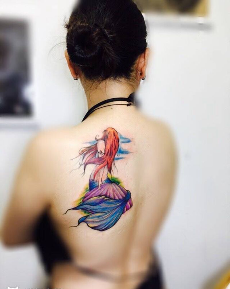 大美人鱼儿纹身图片_成品背部欧美清新纹身图案