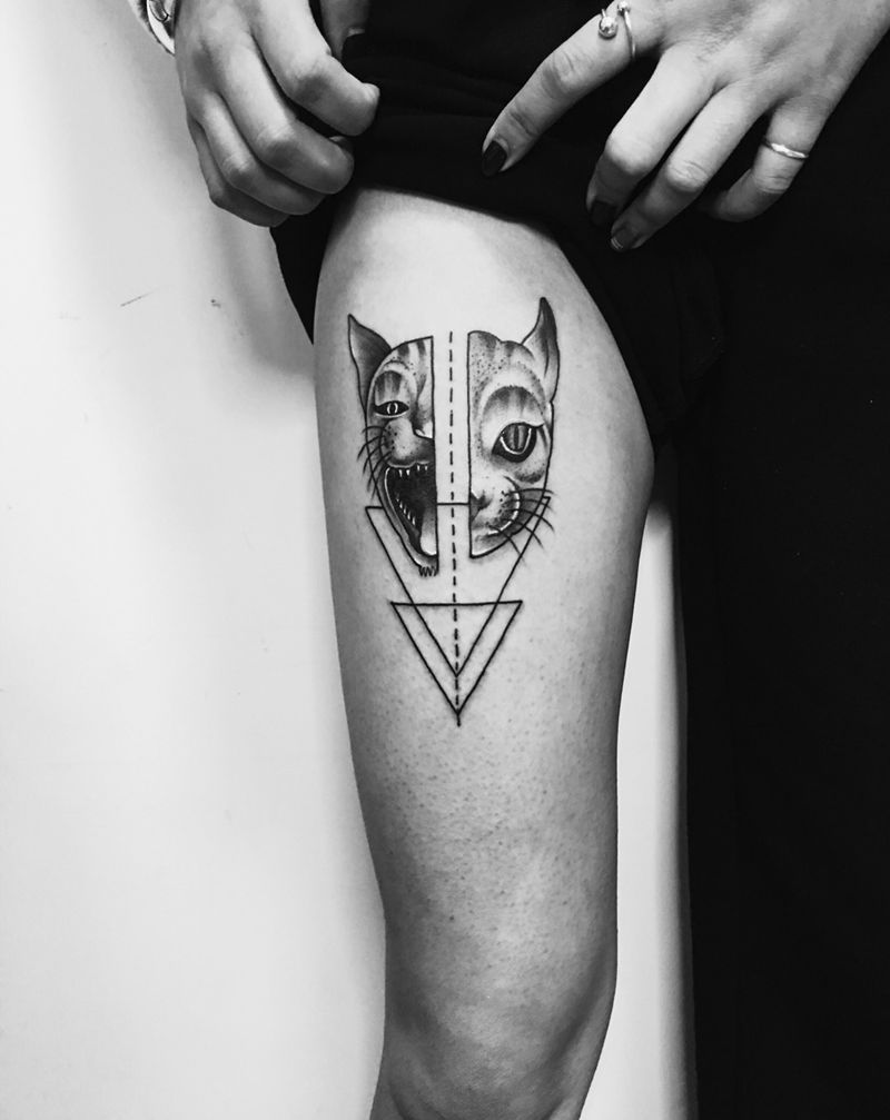 猫喵咪纹身图片_成品腿部动物几何纹身图案