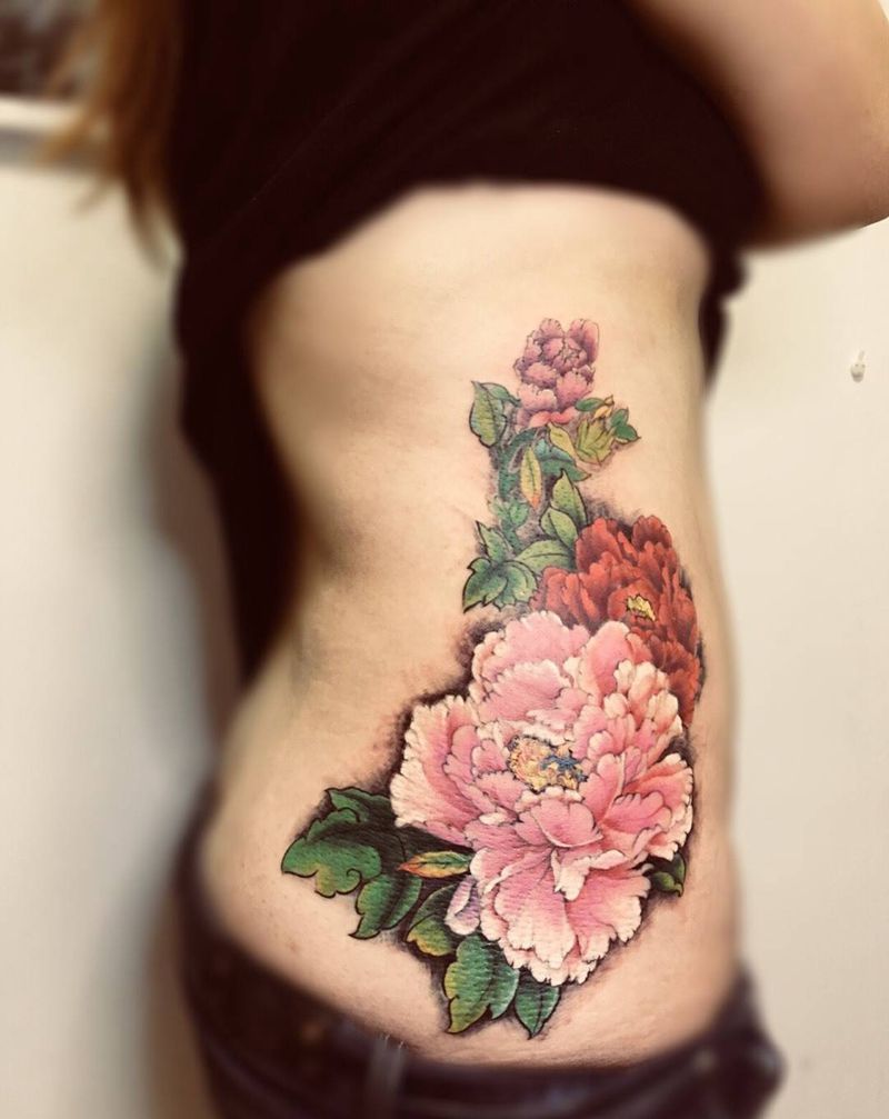 花开富贵纹身图片_成品腰部传统植物国画纹身图案