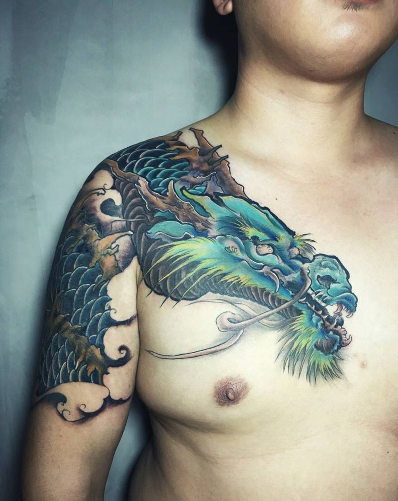 大龙遮盖纹身图片_手臂胸部新传统纹身图案