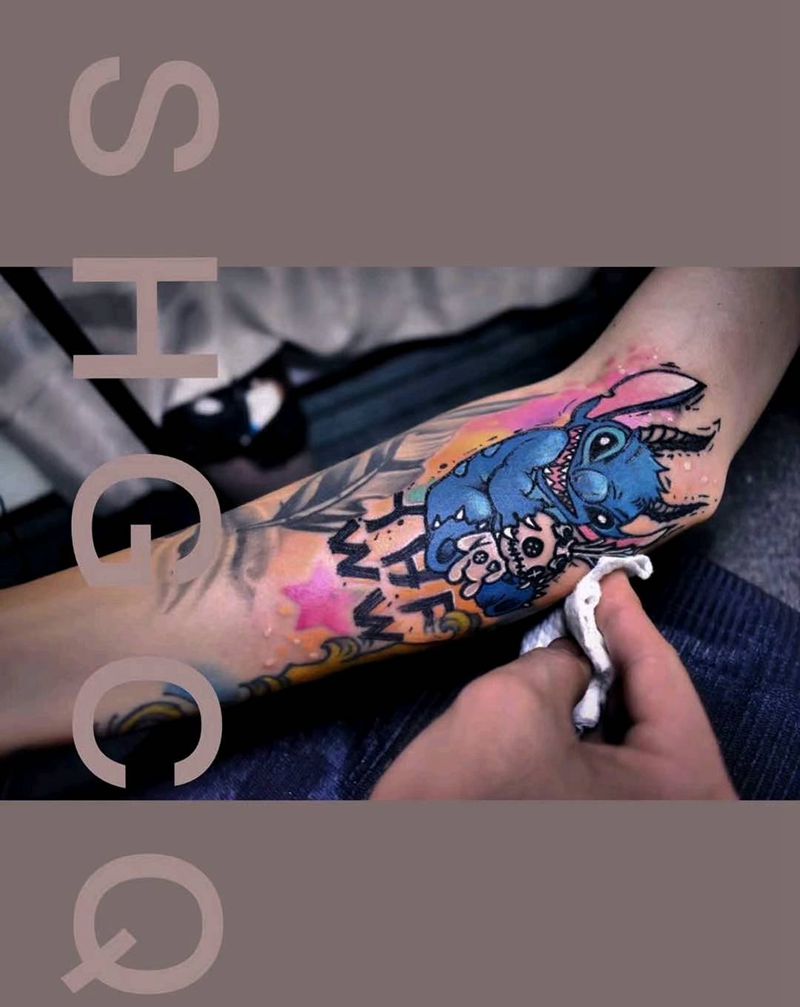 当前位置: 首页 >云南省昆明市纹身店-「蓬魚山」TATTOO—私人定制纹身图案>史迪仔纹身图片_手臂New School水彩史迪仔纹身图案