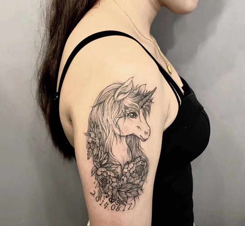当前位置: 首页 >云南省昆明市纹身店-源刺青纹身图案>素花独角兽纹身图片_手臂点刺纹身图案