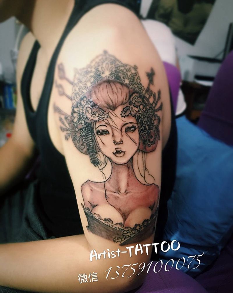 当前位置: 首页 >云南省昆明市纹身店-源刺青纹身图案>艺妓纹身图片_成品手臂传统人物纹身图案
