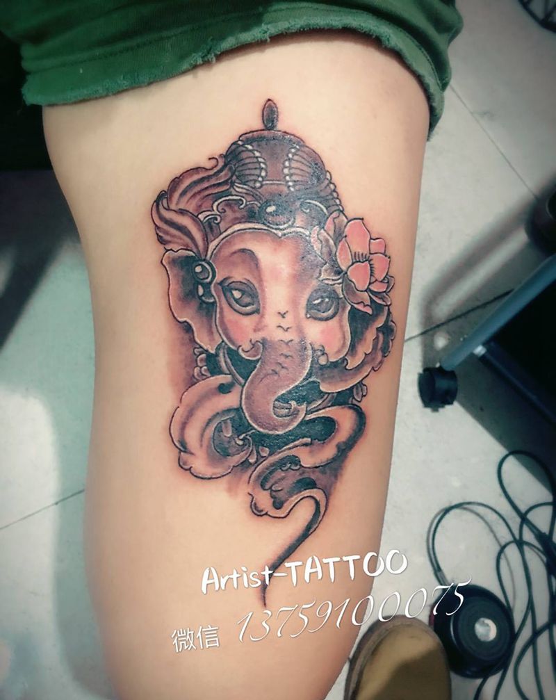当前位置: 首页 >云南省昆明市纹身店-源刺青纹身图案>小象神纹身图片_成品腿部传统鬼神纹身图案
