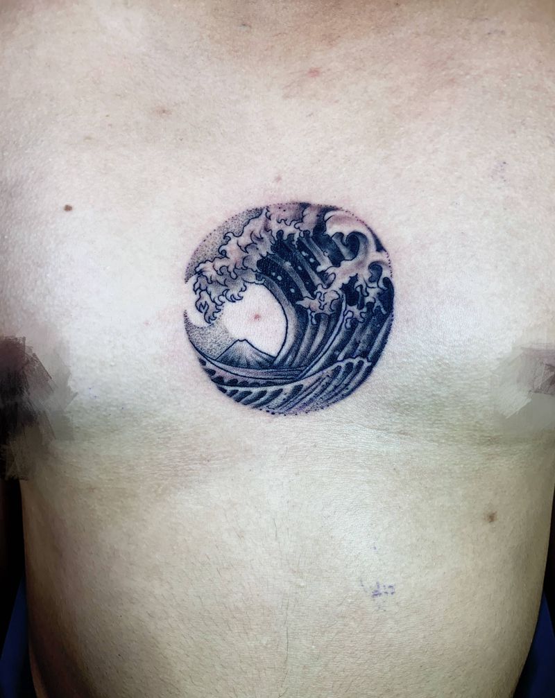 传统浪花纹身图片_胸部老传统点刺纹身图案