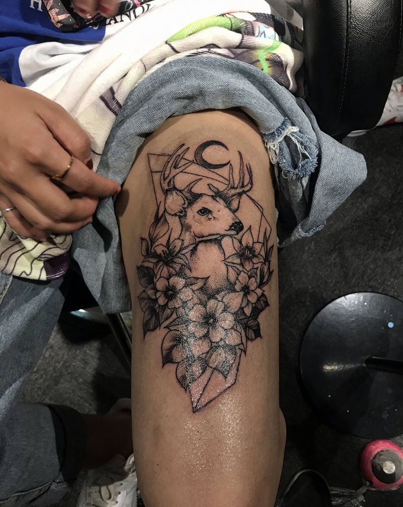 当前位置: 首页 >云南省昆明市纹身店-叁石刺青纹身图案>麋鹿纹身图片_腿部点刺纹身图案