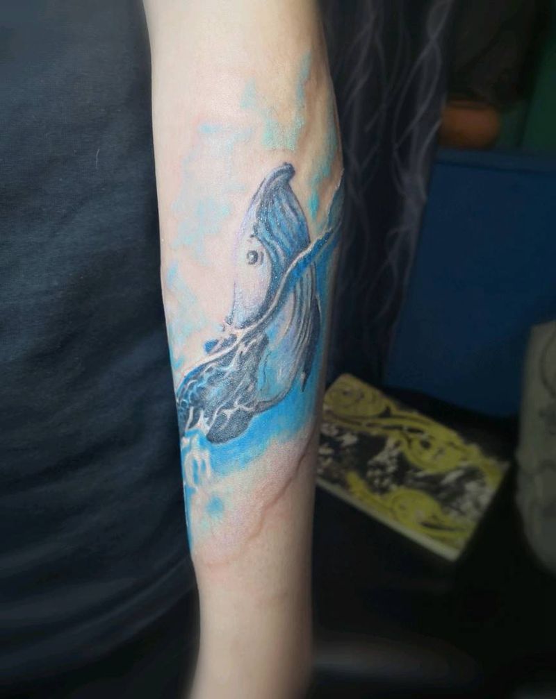 海蓝时见鲸纹身图片_手臂水彩纹身图案