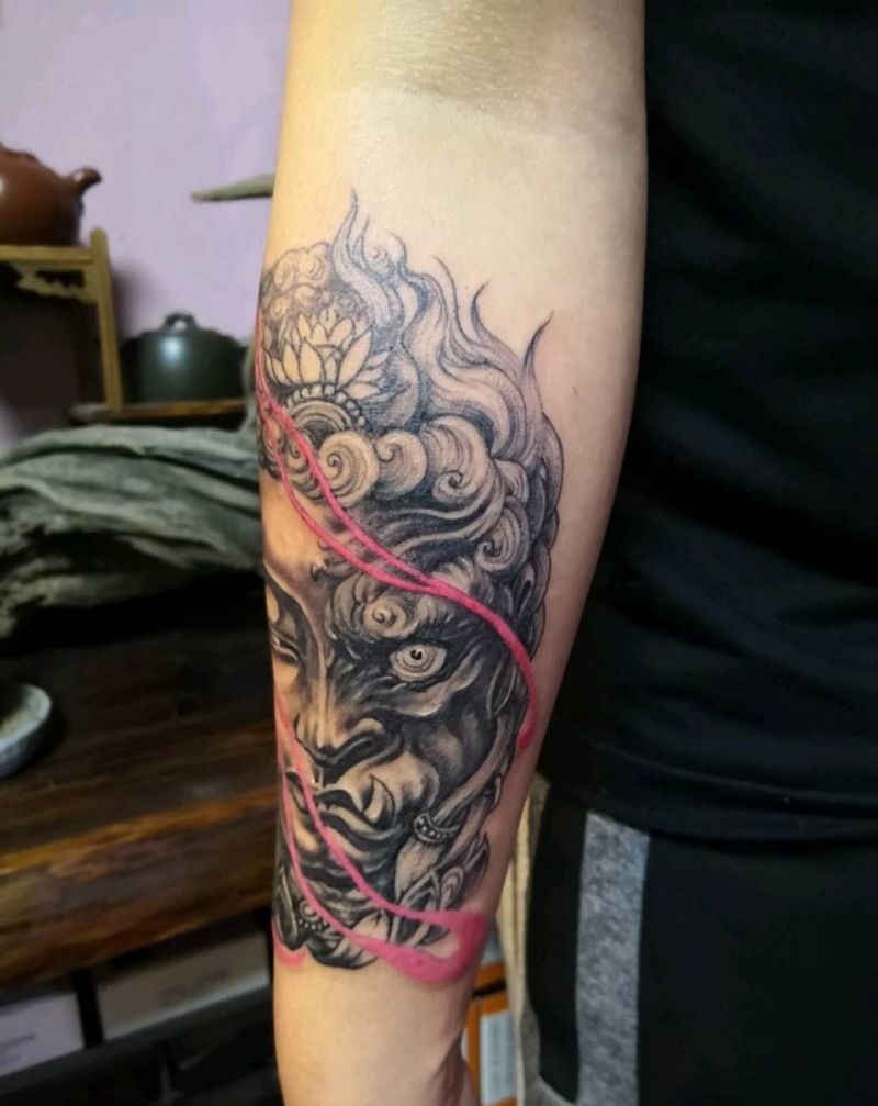 当前位置: 首页 >云南省昆明市纹身店-雕衍刺青纹身图案>一念之间纹身图片_手臂新传统纹身图案